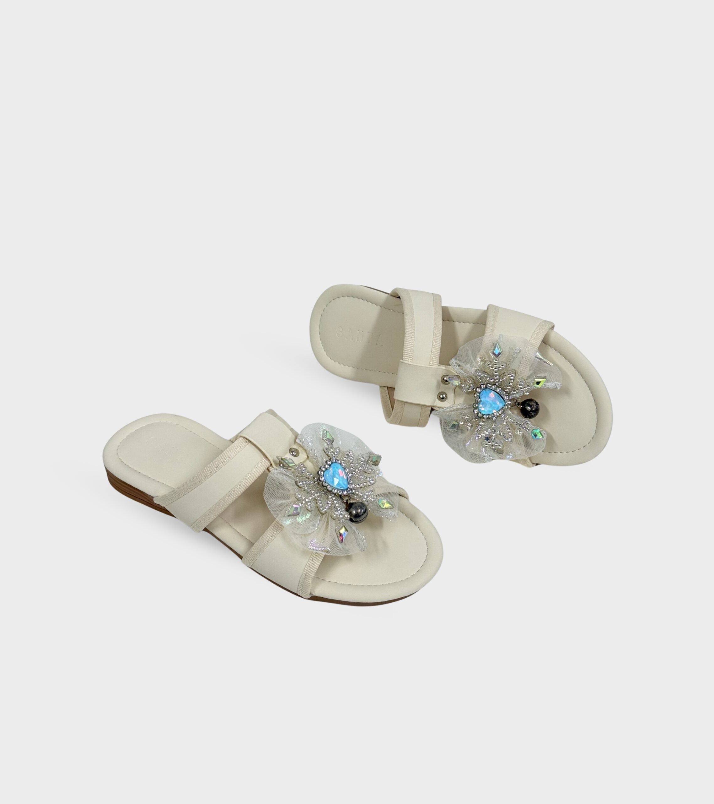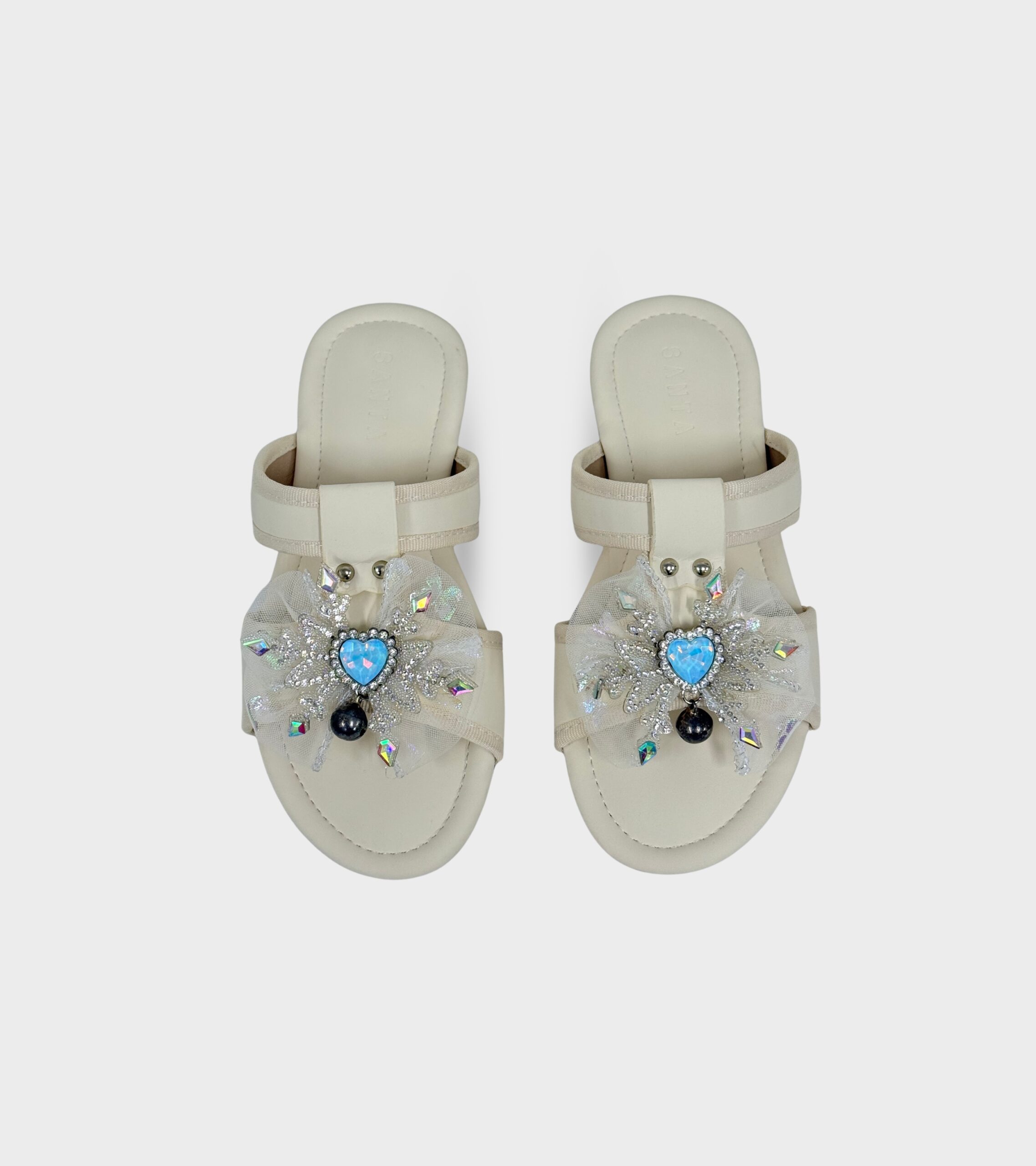 Charming and full of sparkle, SANTA FOOTWEAR KIDS Sparkle Fairy Sandals are designed to make every step feel a little more magical. Featuring a delicate mesh bow adorned with shimmering crystals and a heart-shaped gem centerpiece, this pair brings a dreamy, fairy-like touch that little girls will adore.